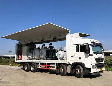 为提高换油车在各种路况的通过性,我们仔细研究了国内各大卡车制造商的各种车辆底盘,经过数据比对和各种路况测试,终选择了中国重汽豪沃8X4的重型车底盘,该重型车底盘为4轴,发动机、变速箱、后桥均引进德国曼恩技术生产制造,车辆的载重能力、越野性能、舒适性均为国内专业,与世界先进水平同步,驾驶室为四点悬浮式,减震和舒适性为国内专业,与曼恩同等水平,越野和通过性非常强,双后桥驱动带轴间和轮间多把差速锁,可跨越1米宽的壕沟,对一些年久失修的风场道路通过性和爬坡能力强,制动效果比较好,是理想的换油设备运载工具。