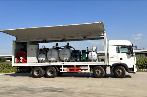 为提高换油车在各种路况的通过性,我们仔细研究了国内各大卡车制造商的各种车辆底盘,经过数据比对和各种路况测试,终选择了中国重汽豪沃8X4的重型车底盘,该重型车底盘为4轴,发动机、变速箱、后桥均引进德国曼恩技术生产制造,车辆的载重能力、越野性能、舒适性均为国内专业,与世界先进水平同步,驾驶室为四点悬浮式,减震和舒适性为国内专业,与曼恩同等水平,越野和通过性非常强,双后桥驱动带轴间和轮间多把差速锁,可跨越1米宽的壕沟,对一些年久失修的道路通过性和爬坡能力强,制动效果很好,是理想的换油设备运载工具。