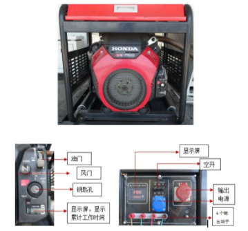 确认风场无可使用电源时,须启动车上自备发电机供电。自备发电机是汽油发动机,要特别注意防火,工作时要通风良好。将钥匙插好,风门向外拔出一截,油门向上抬起2/3,向右转动钥匙启动。显示屏电压达到“400”即可正常工作。在发电机运行1-2分钟后将风门推进恢复原始位置。